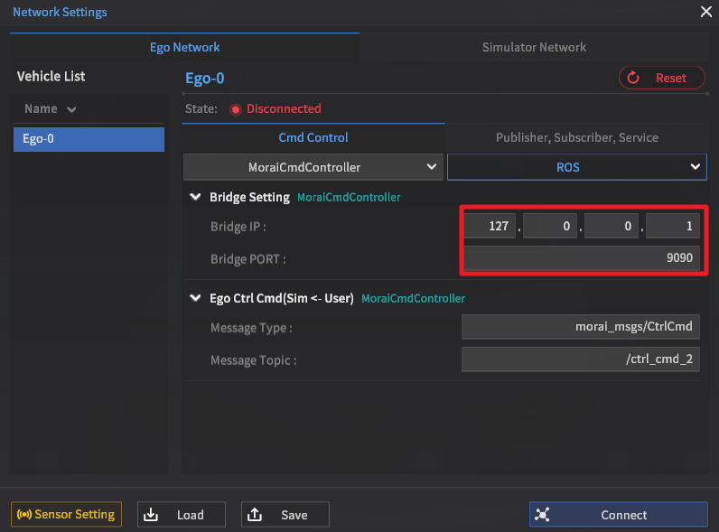 Simulator의 Edit > Network Setting 메뉴에서 해당 테스트 Scenario를 저장할 때 필요한 네트워크 정보를 아래와 같이 입력한다.